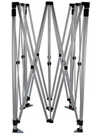Heavy duty hex shape 40 mm. aluminum hardware gives the tent strength in outdoor installations. Telescopic legs allow you to adjust the height, and the interior lattice expands the tent interior with the crank of a handle. Each leg has a foot plate ready to be staked to the ground. (Ropes, stakes, and standard carrying bag included with hardware).